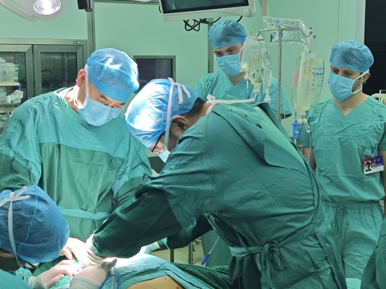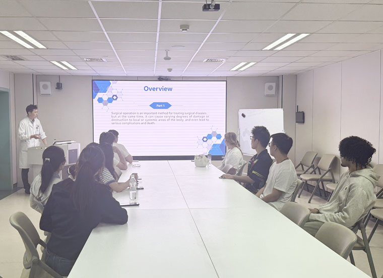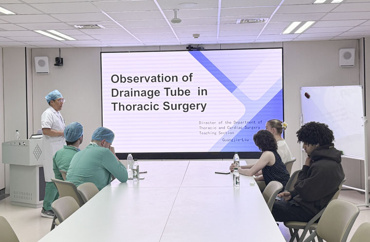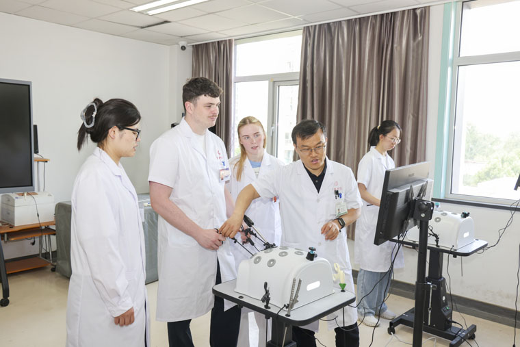“实践育人”是医院始终坚持的教学理念。在胸外科和外科教研室的支持下,爱尔兰学子深度参与临床一线:跟随专家门诊学习问诊技巧,参与病房病例讨论,近距离观摩手术操作,在技能中心进行“腔镜下夹豆子”等基础技能训练。“医学无国界,专业精神是共同语言”,这段沉浸式临床经历成为同学们未来行医路上的重要基石。