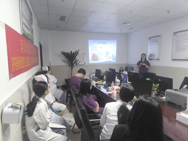 在理论授课环节,刁玉巧主任介绍了我院在新生儿救治领域的主要技术、新生儿脐静脉置管术的应用进展;张文浩主治医师讲解了脐静脉置管的技术要点;王瑛玮护士长分享了脐静脉置管细节决定成败的护理经验;许彦平主管护师针对无创辅助通气操作流程进行细致剖析。实践操作环节,儿科团队进行了规范化现场模拟操作演示,手把手教学,从器械准备、穿刺技巧到固定方法,每一个步骤均进行了细致示范与讲解,确保参训医护人员精准掌握技术要点。针对操作过程中可能出现的问题,现场同步进行答疑解惑。专家团队还针对该院新购置的呼吸机进行了个性化指导。
