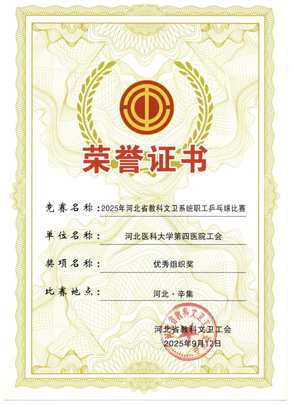 9月9-12日,2025年河北省教科文卫系统职工乒乓球比赛在辛集举办,赛事由省教科文卫工会主办、辛集市总工会承办。我院工会积极组织、精心筹备职工参赛,荣获“优秀组织奖”骨科范晓杰中年男子组单打项目中位列第五名。