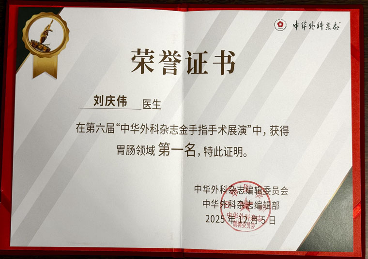 近日,我院外三科刘庆伟副教授在中华外科杂志编辑委员会主办的第六届普通外科中青年医师手术展演暨“中华外科杂志金手指手术展演”全国总展演中,从全国12名外科高手中脱颖而出,荣获“中华外科杂志金手指奖”全国总决赛第一名,展现了我院在胃肠微创外科领域的硬核实力与领先水平。