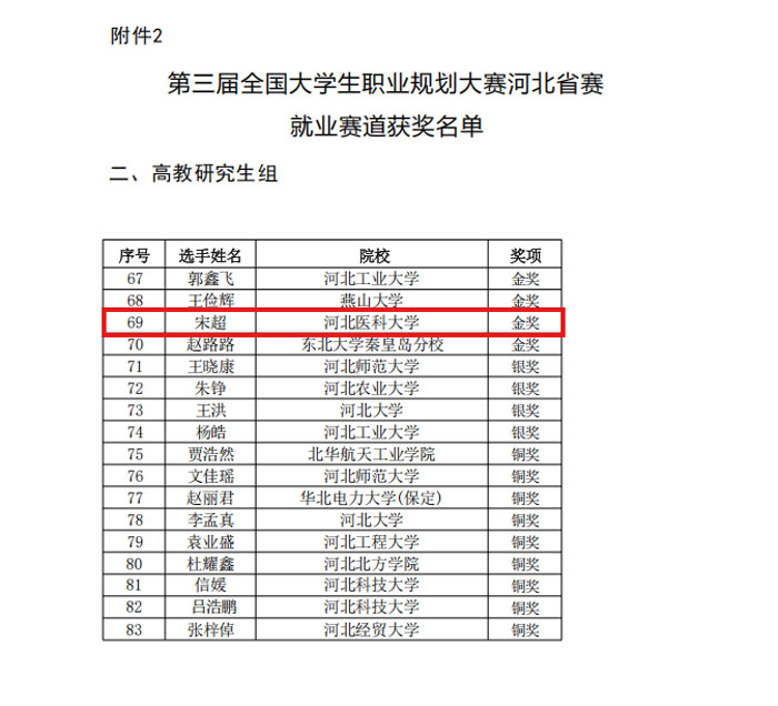 近日,第三届全国大学生职业规划大赛河北省大学生职业规划大赛决赛在燕山大学落幕,我院2023级普外科专硕研究生宋超凭借扎实的专业积淀、清晰的职业定位与出色的现场表现,在众多参赛选手的激烈角逐中脱颖而出,成功斩获高教组就业赛道省级金奖,为学校与医院赢得了荣誉,彰显了我院学子深耕医学领域、规划职业未来的青春风采。